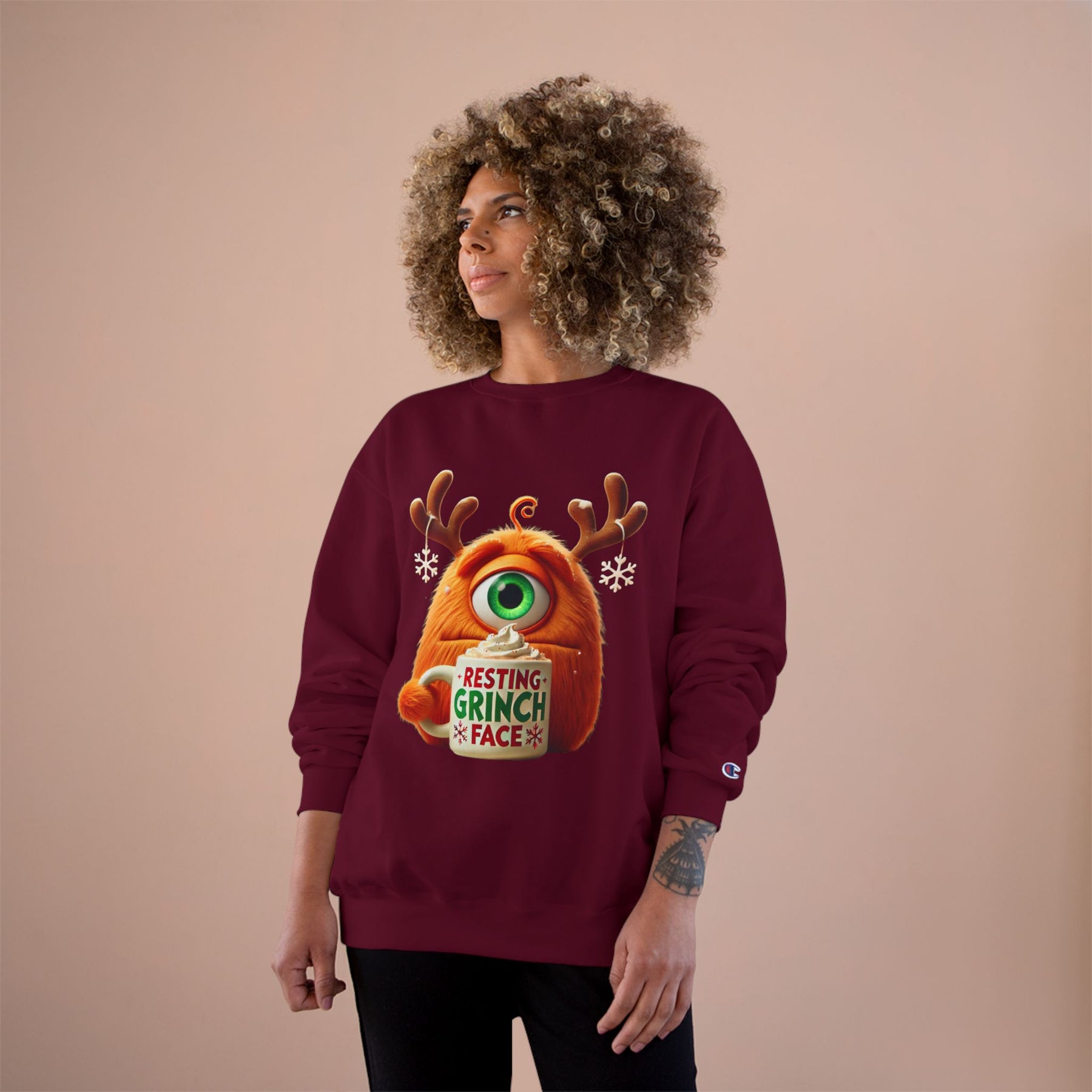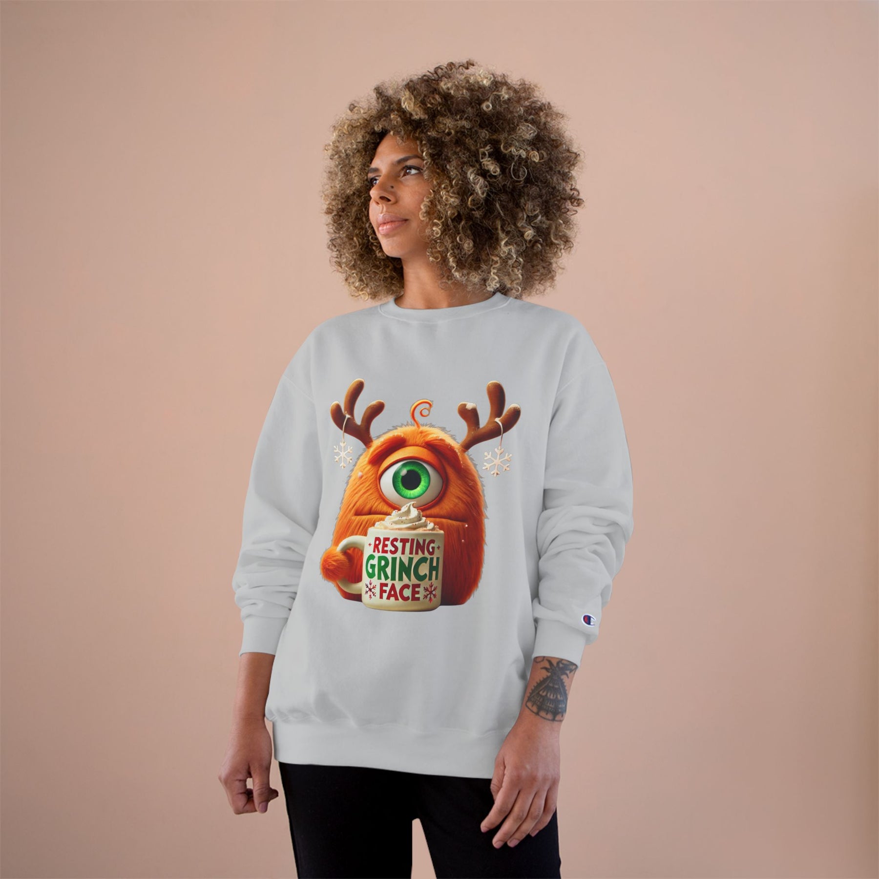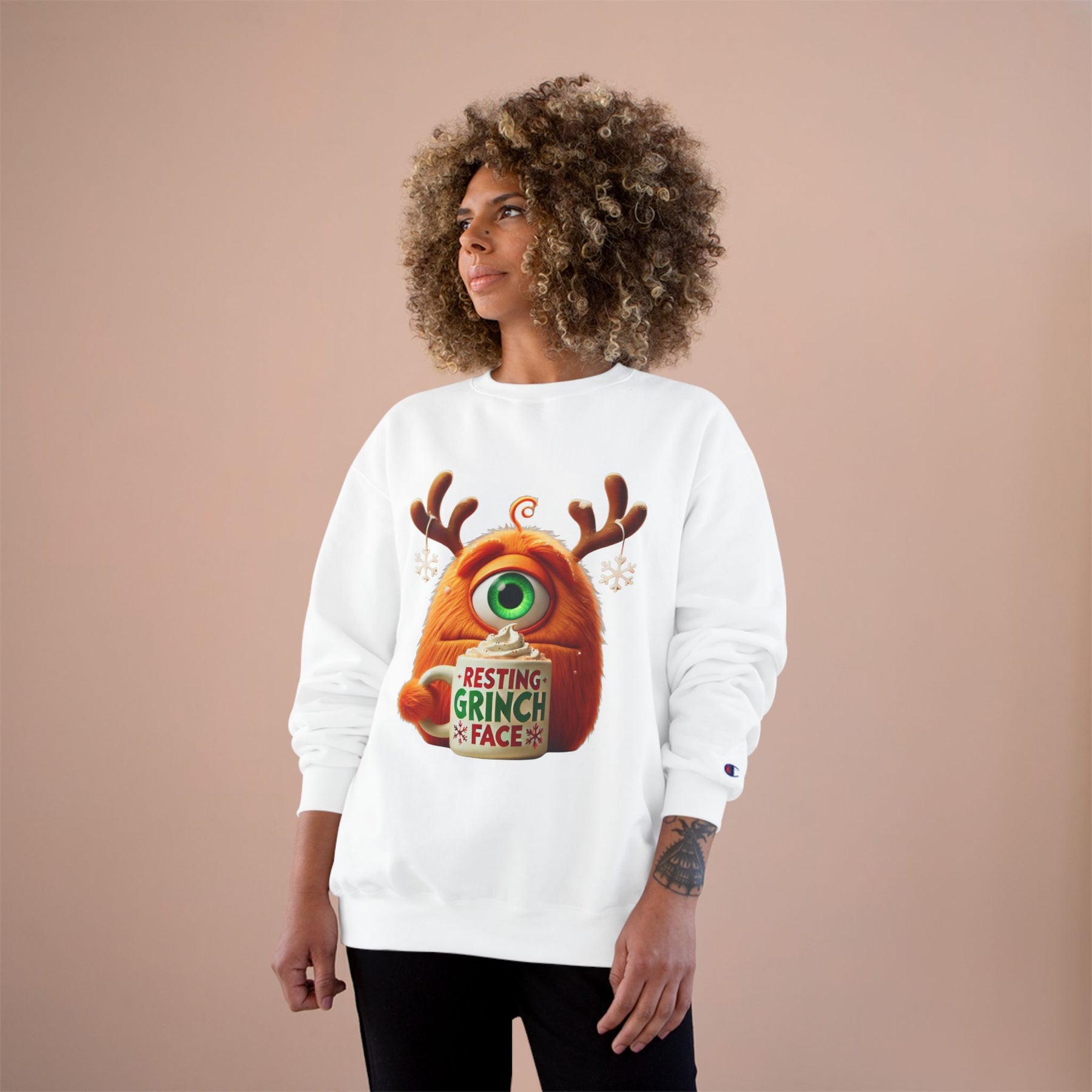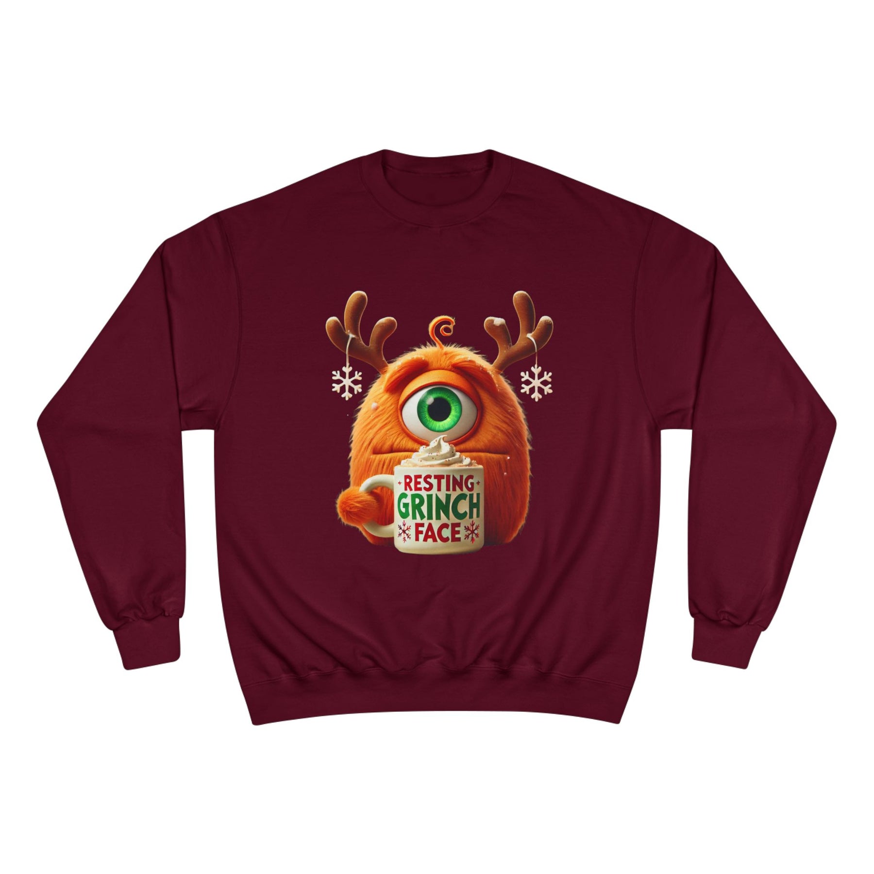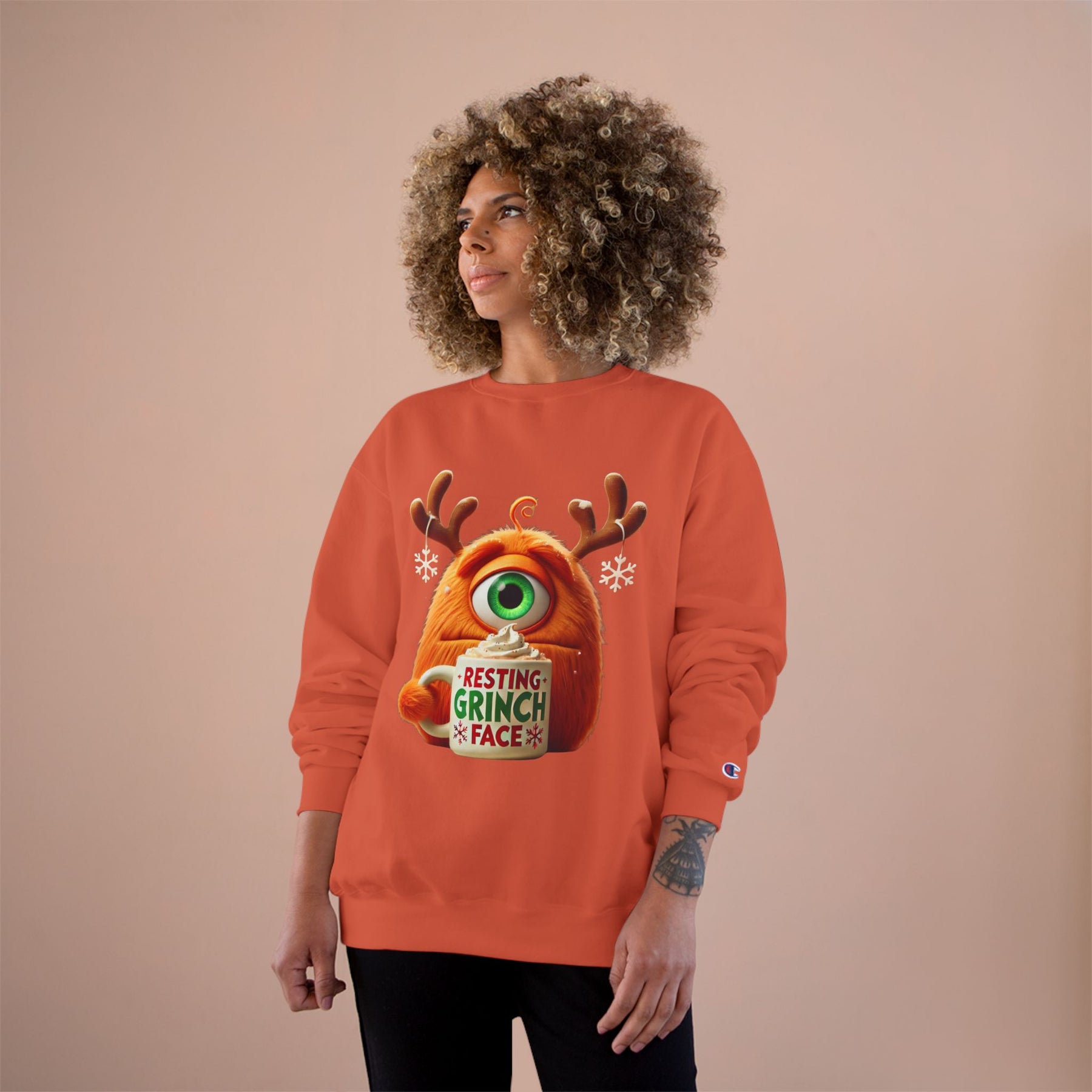 This cozy sweatshirt carries a playful, slightly grumpy holiday vibe — an orange, one-eyed monster wearing antlers and holding a mug that reads “Resting Grinch Face.” It feels like a warm exhale on a chilly morning: soft midweight fabric, ribbed cuffs and hem that keep heat in, and a smooth surface that lets the colorful print pop. Wear it when you want to be casual and comforted, while still sending a wry, seasonal message. The regular fit layers easily over shirts or pajamas and the tubular knit construction gives a clean silhouette without side seams. Subtle Champion details (sewn-in label, small “C” on the sleeve) hint at quality without shouting. This sweatshirt settles into quiet holiday rituals — sipping cocoa, untangling lights, laughing at family banter — and becomes an honest, comfortable part of those moments.