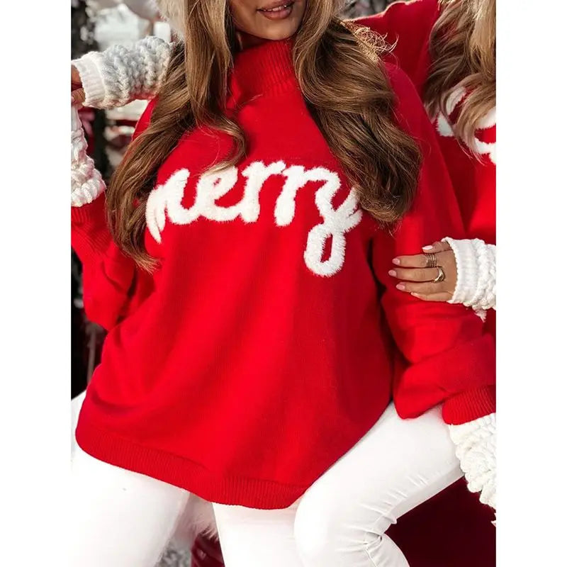 Women's Autumn Loose Sweater Letter Embroidery Long Sleeve Turtle Neck Knitwear Pullover for ChristmasSize(cm):