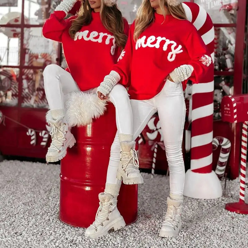 Combhasaki Women Christmas Autumn Winter Loose Fit Sweater Top Fuzzy Letter Embroidery Long Sleeve Turtle Neck Knitwear Pullover