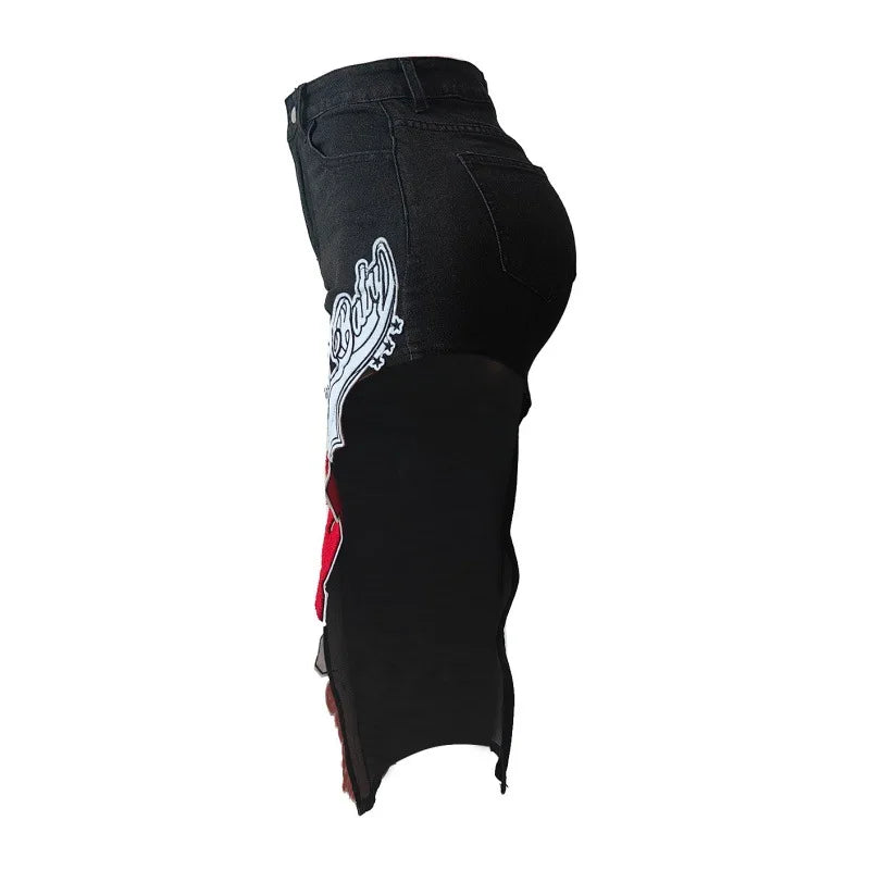 Letter Embroidery Asymmetrical Denim Skirts Women Fashion Vintage Button Fly High Waist Stretch Jeans Calf-length Skirt Bottoms