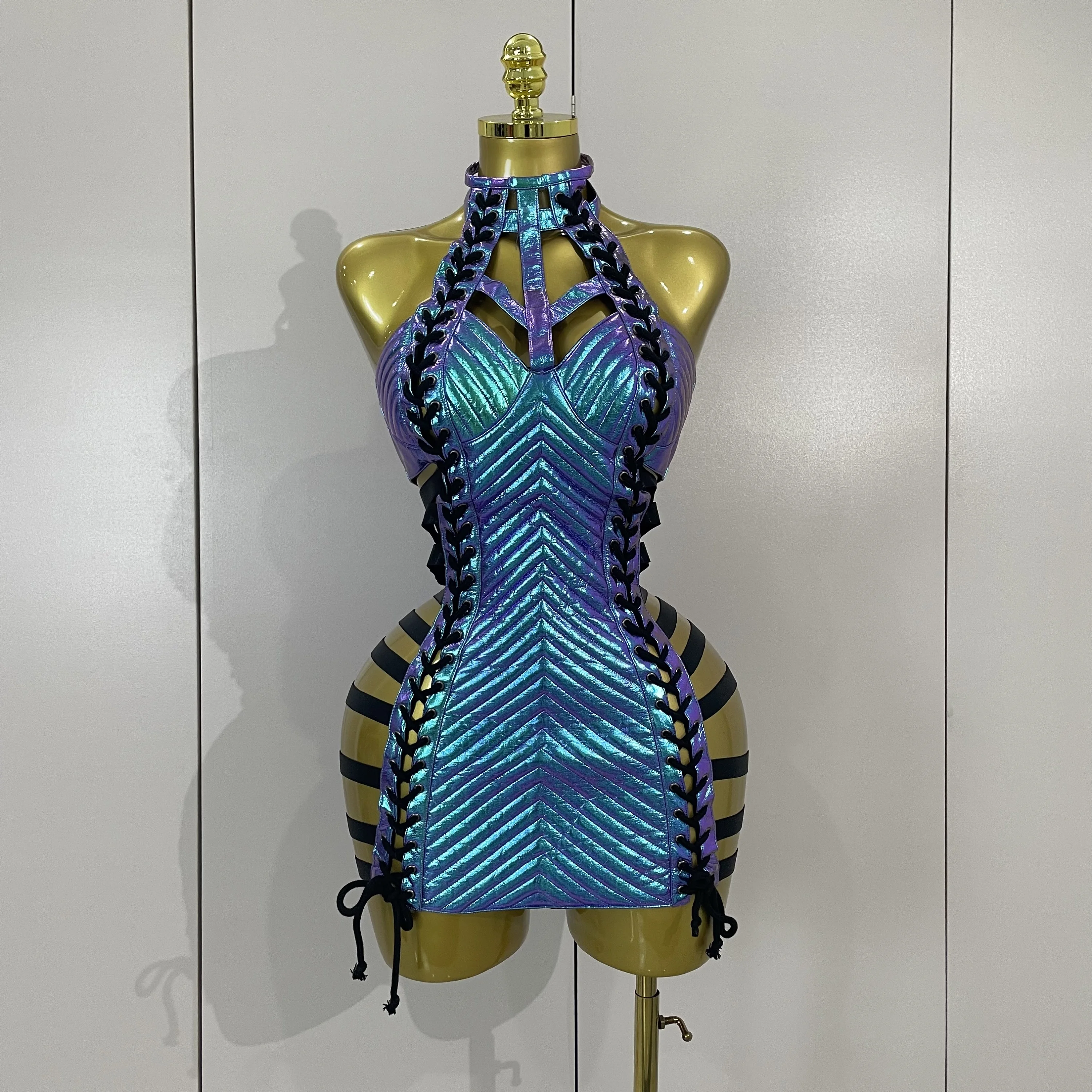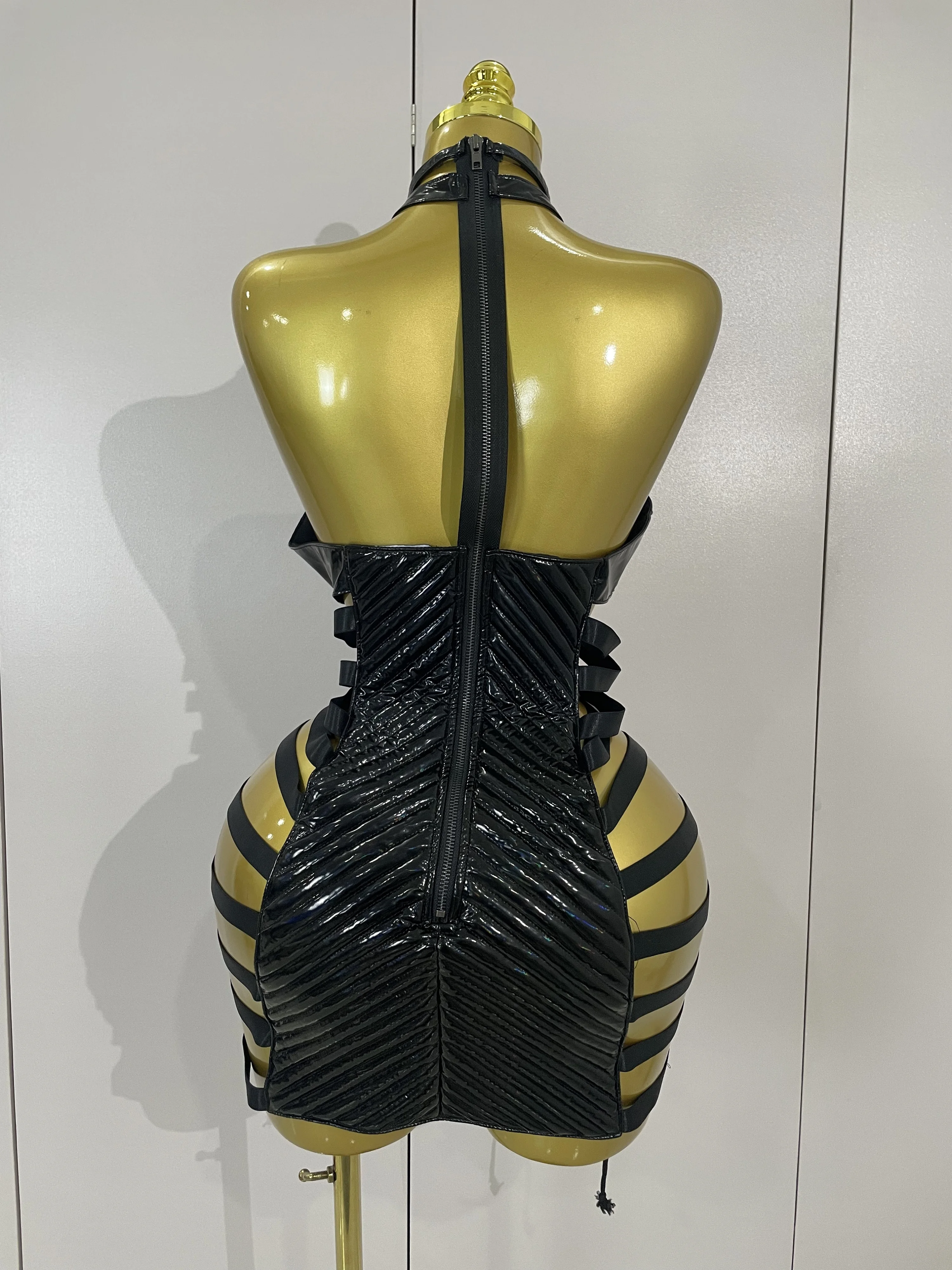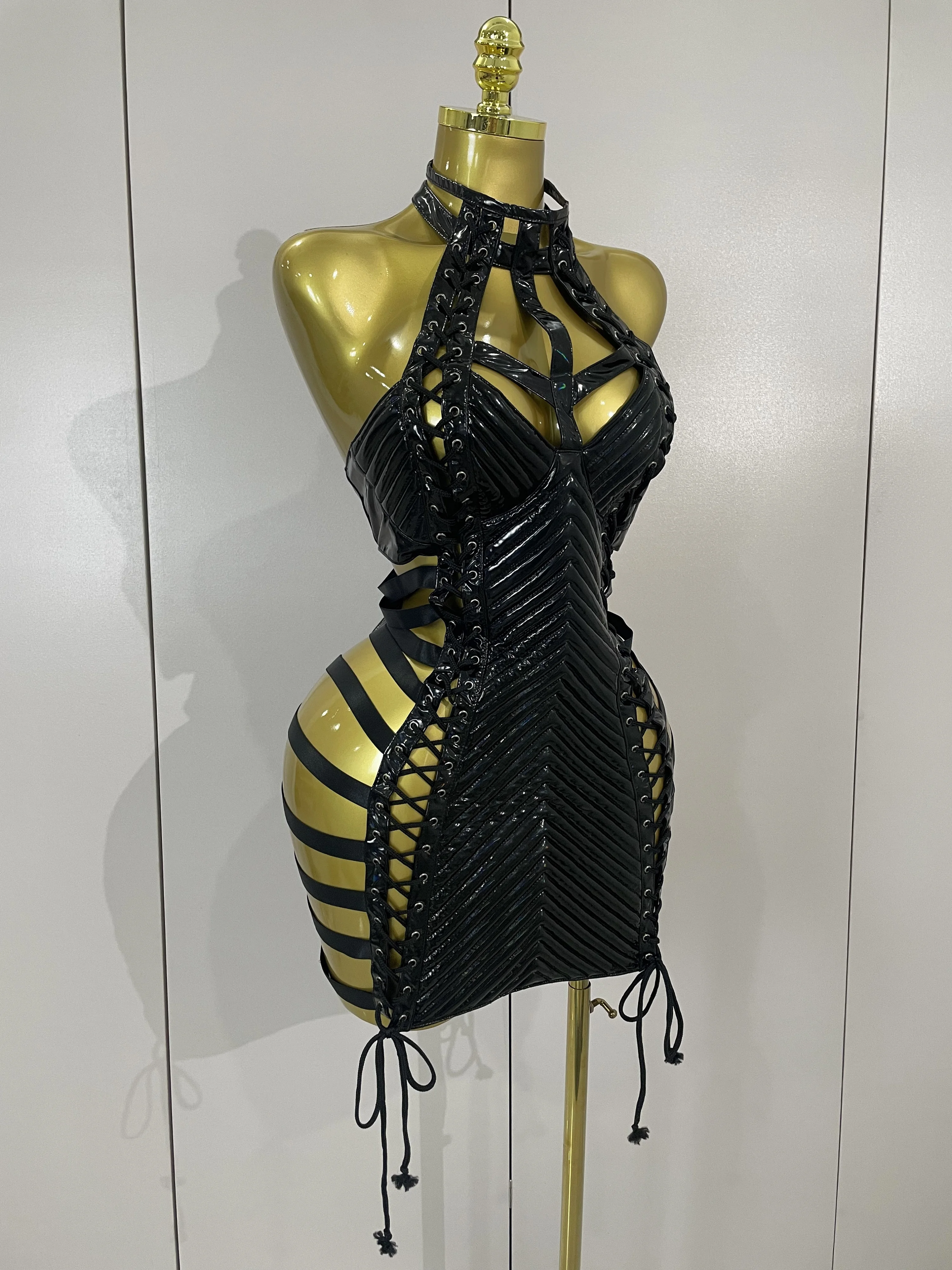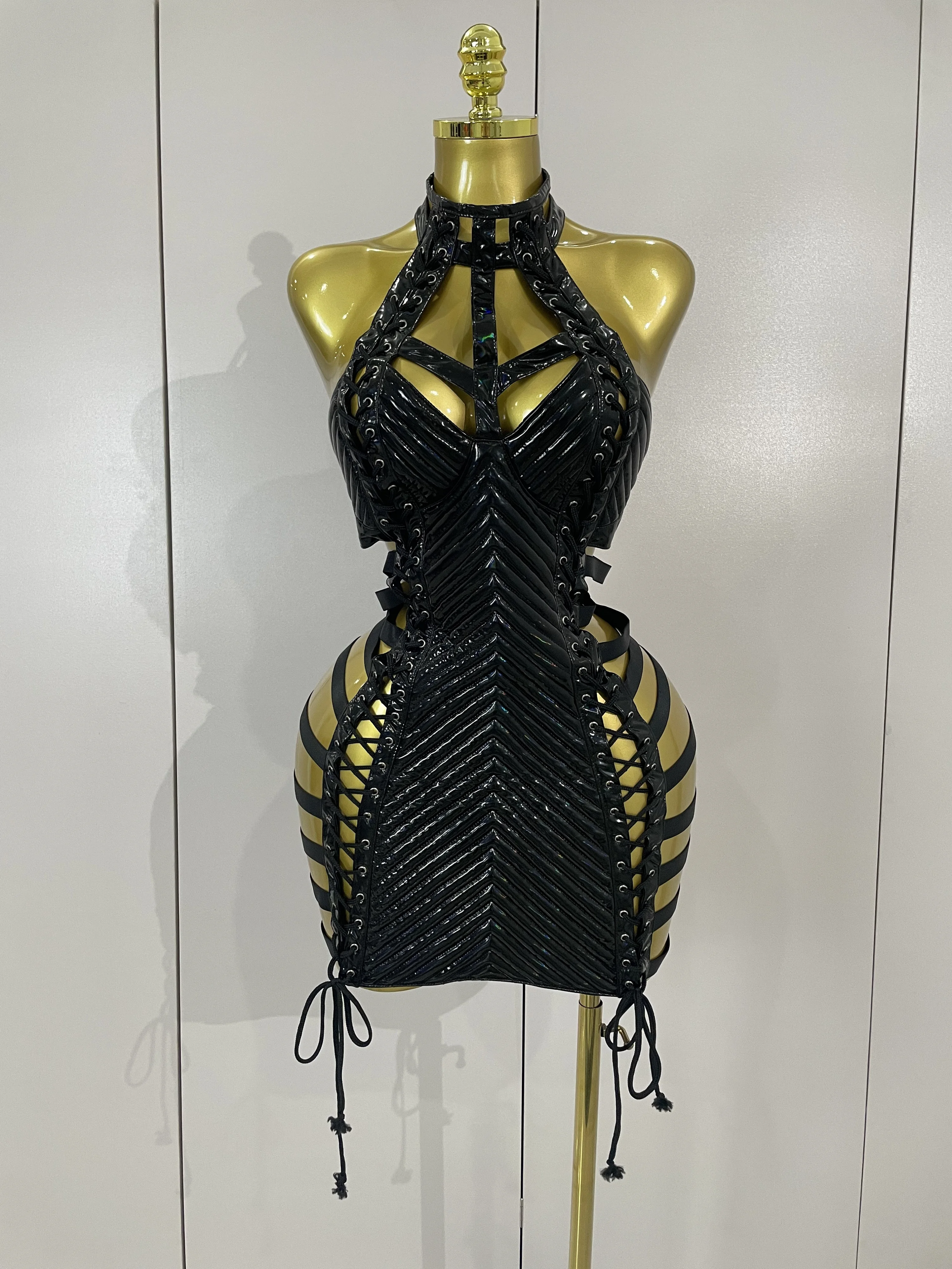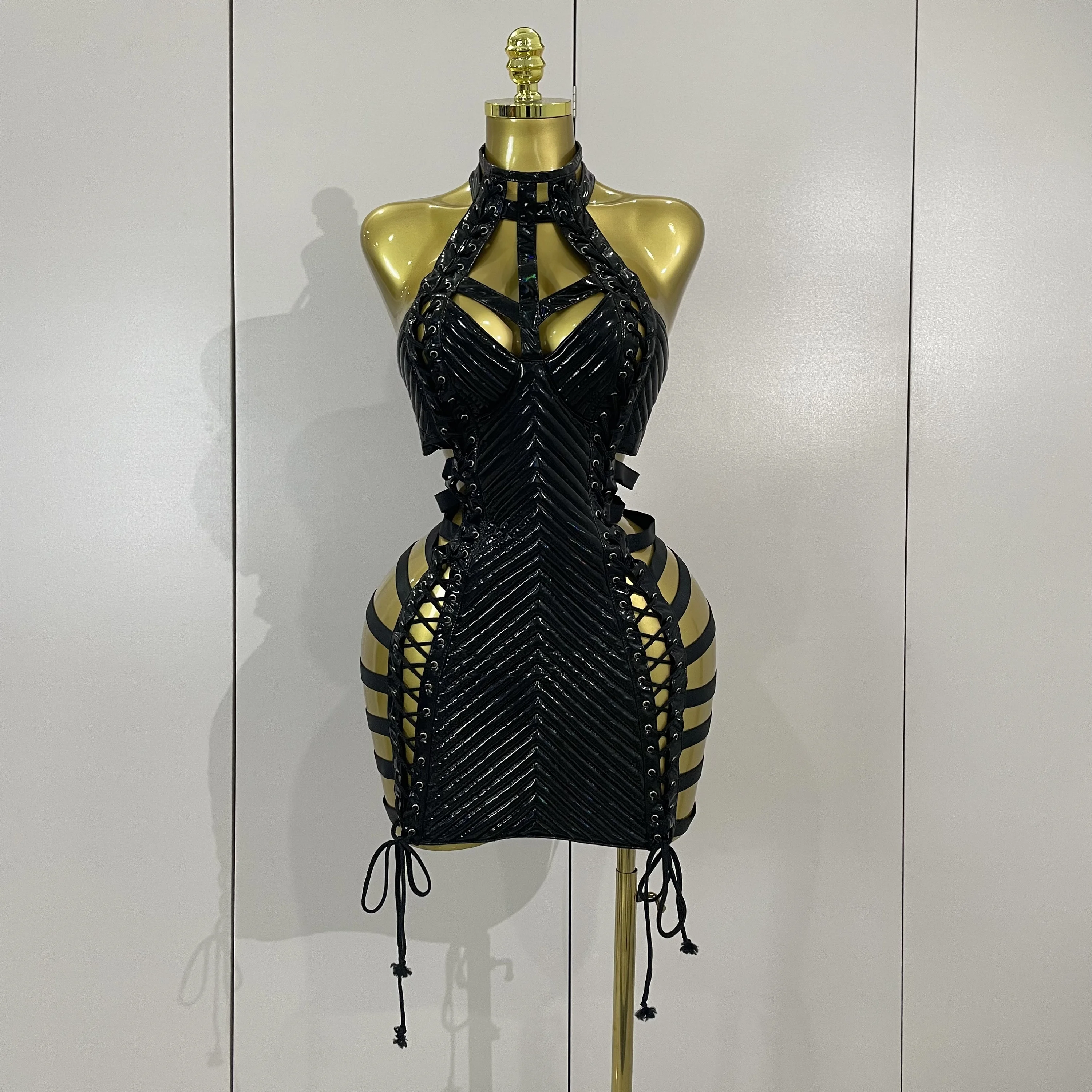Sexy Black Leather Hollow Out Gothic Bandage Halter Short Dress Women Gogo Dance Singer Nightclub Bar Performance Stage Wear