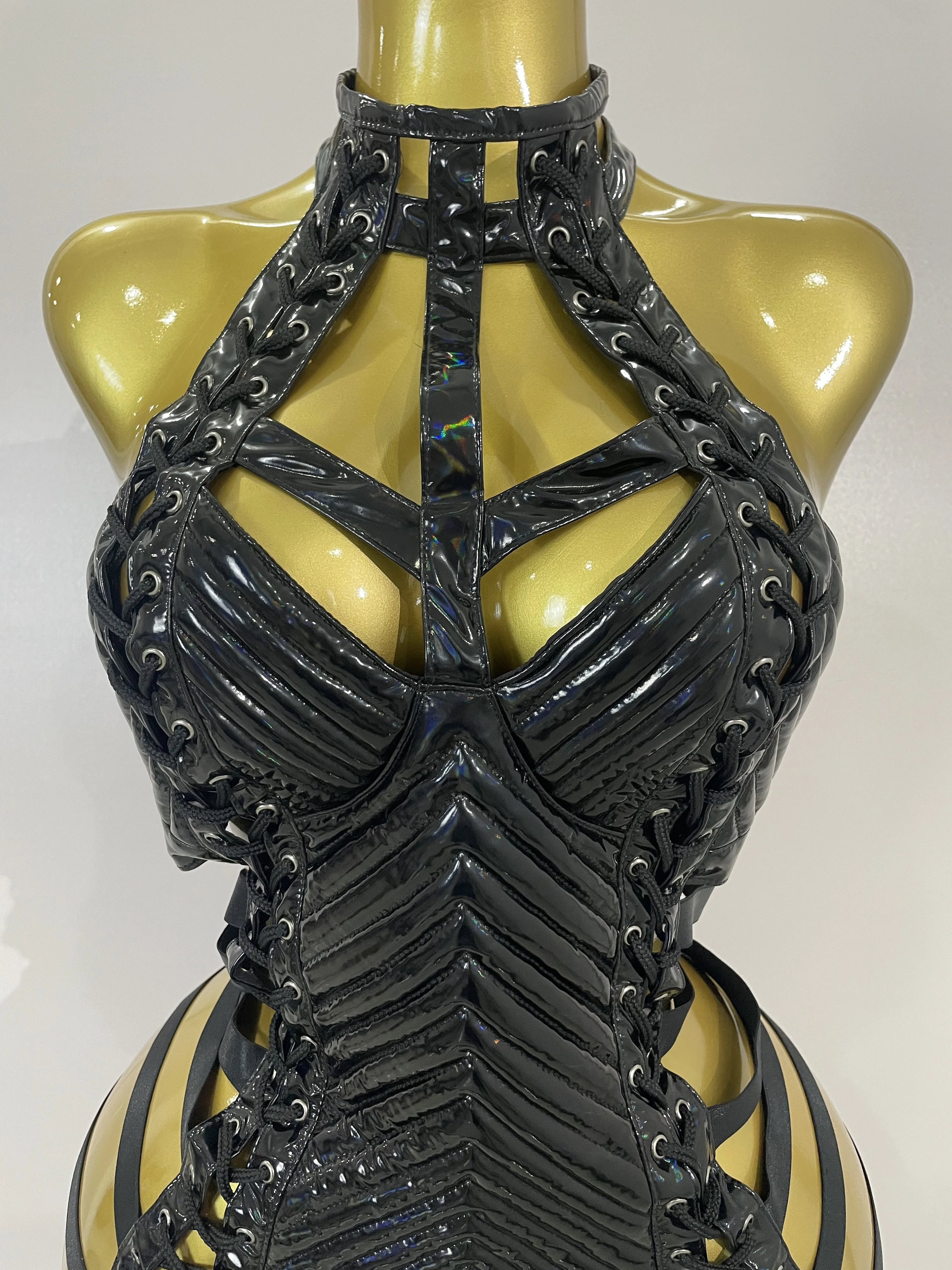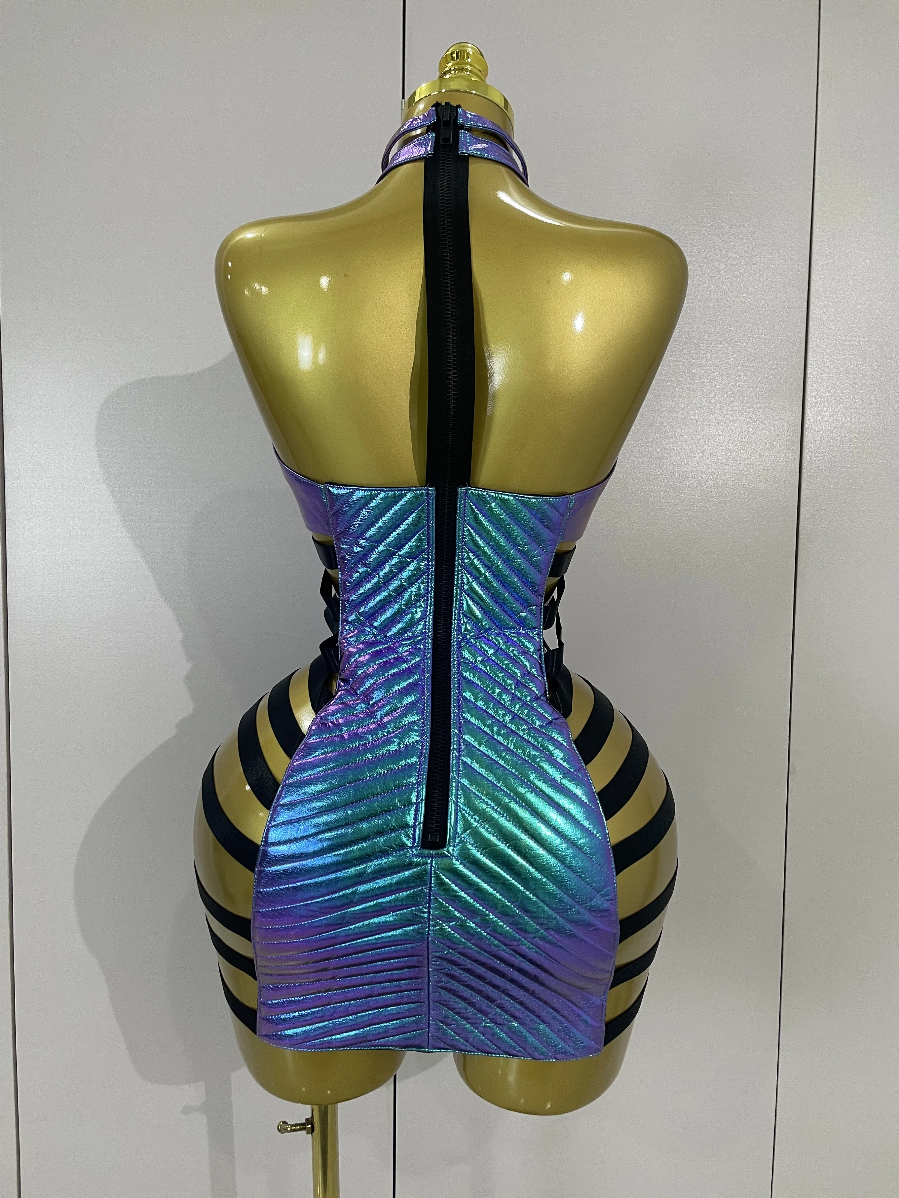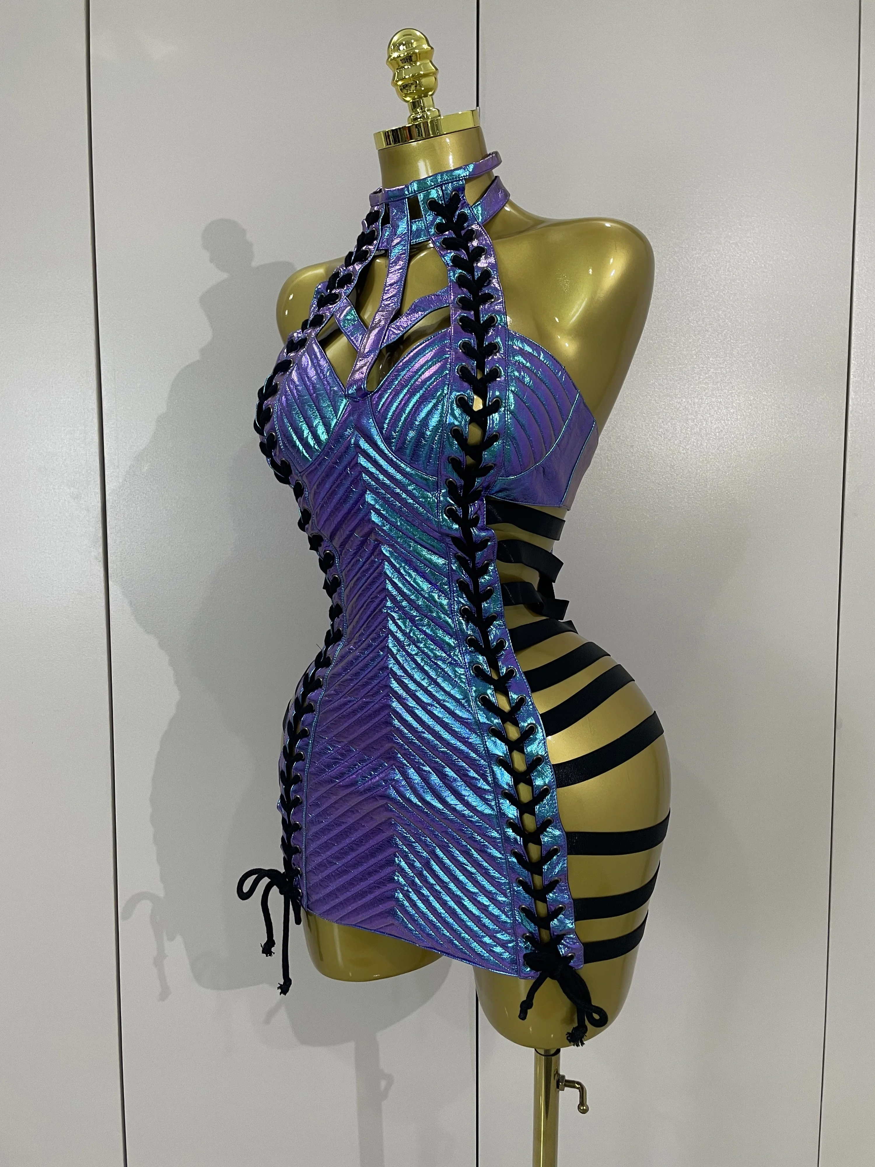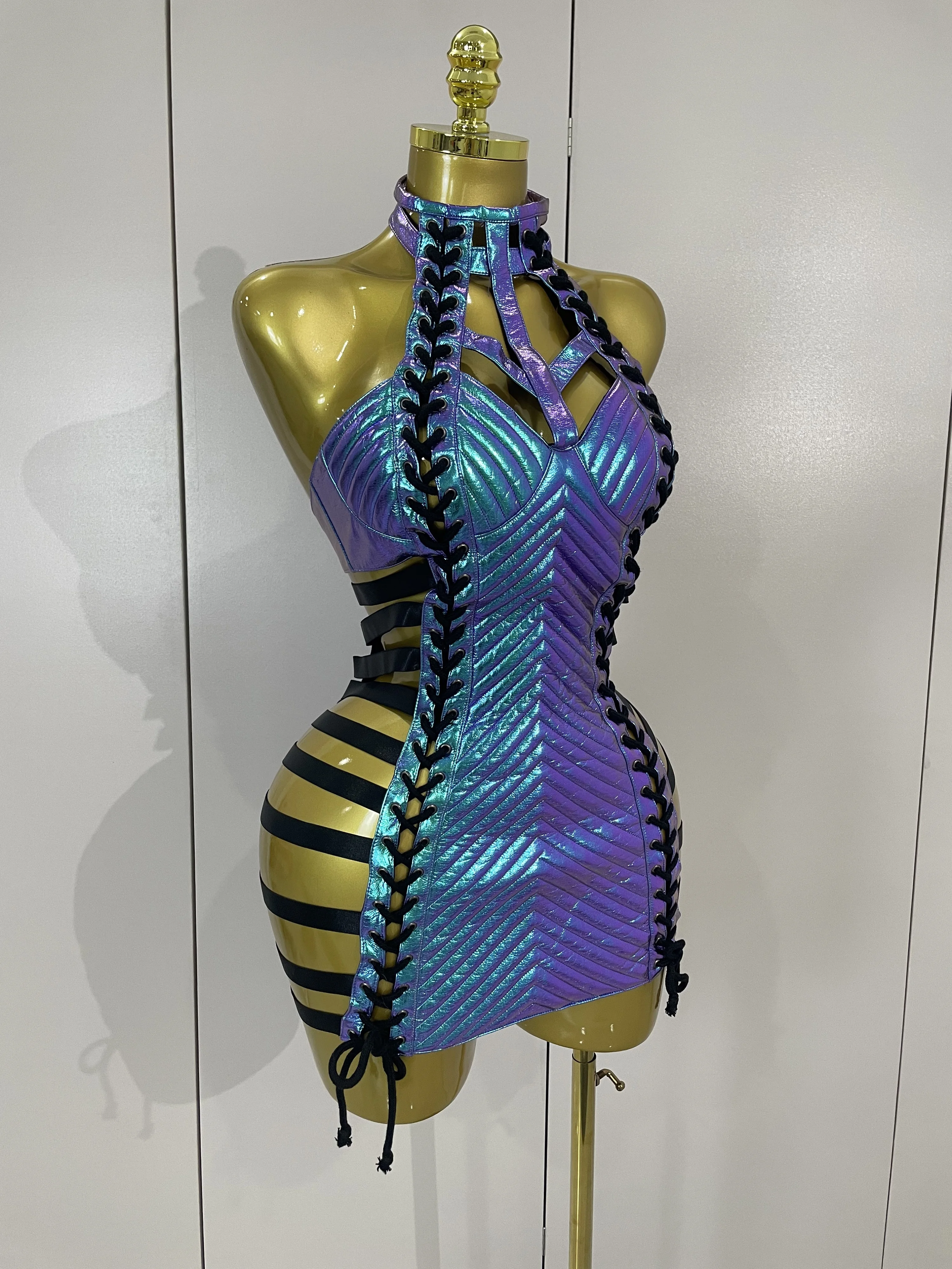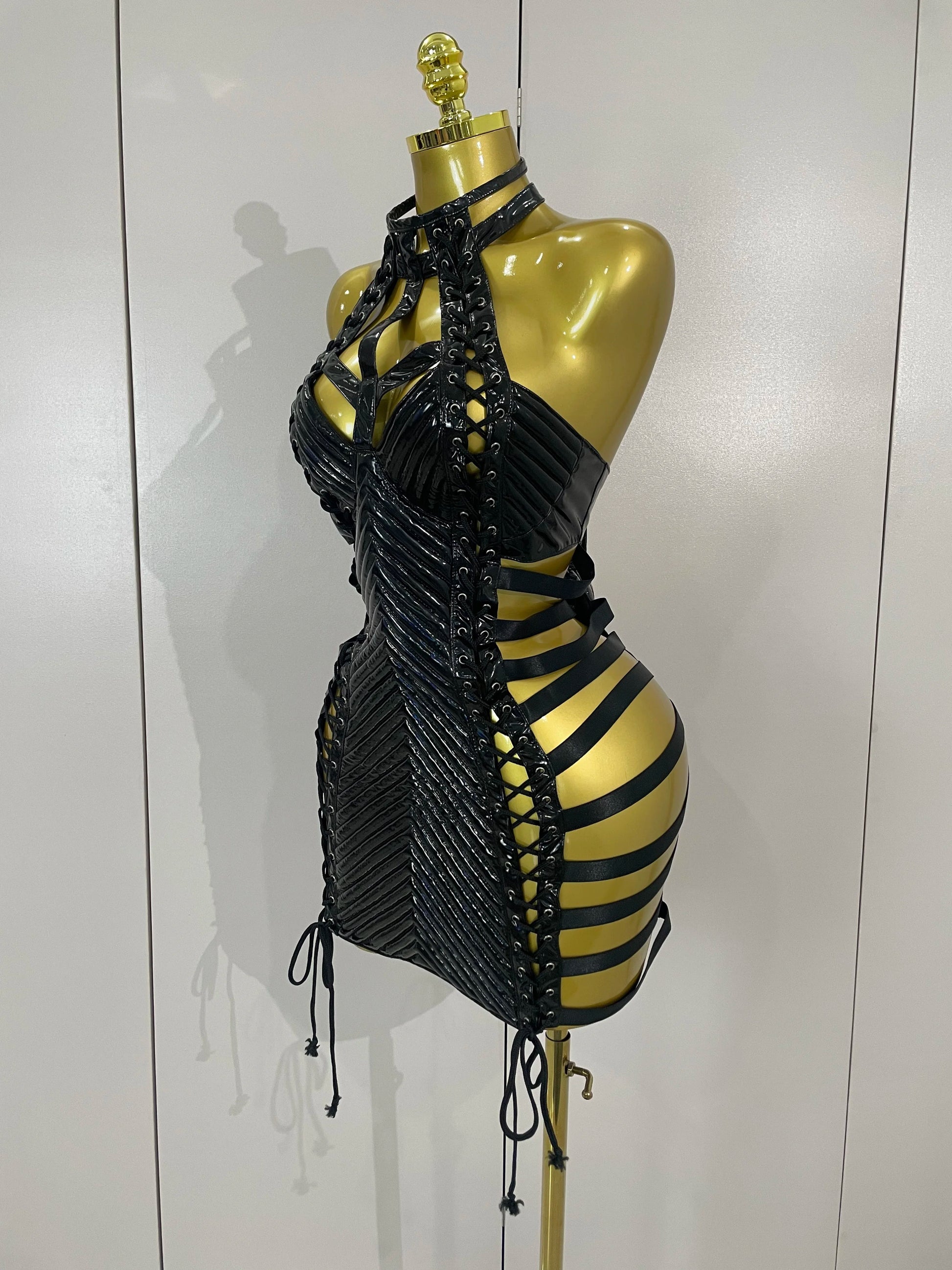 Sexy Black Leather Hollow Out Gothic Bandage Halter Short Dress Women Gogo Dance Singer Nightclub Bar Performance Stage Wear