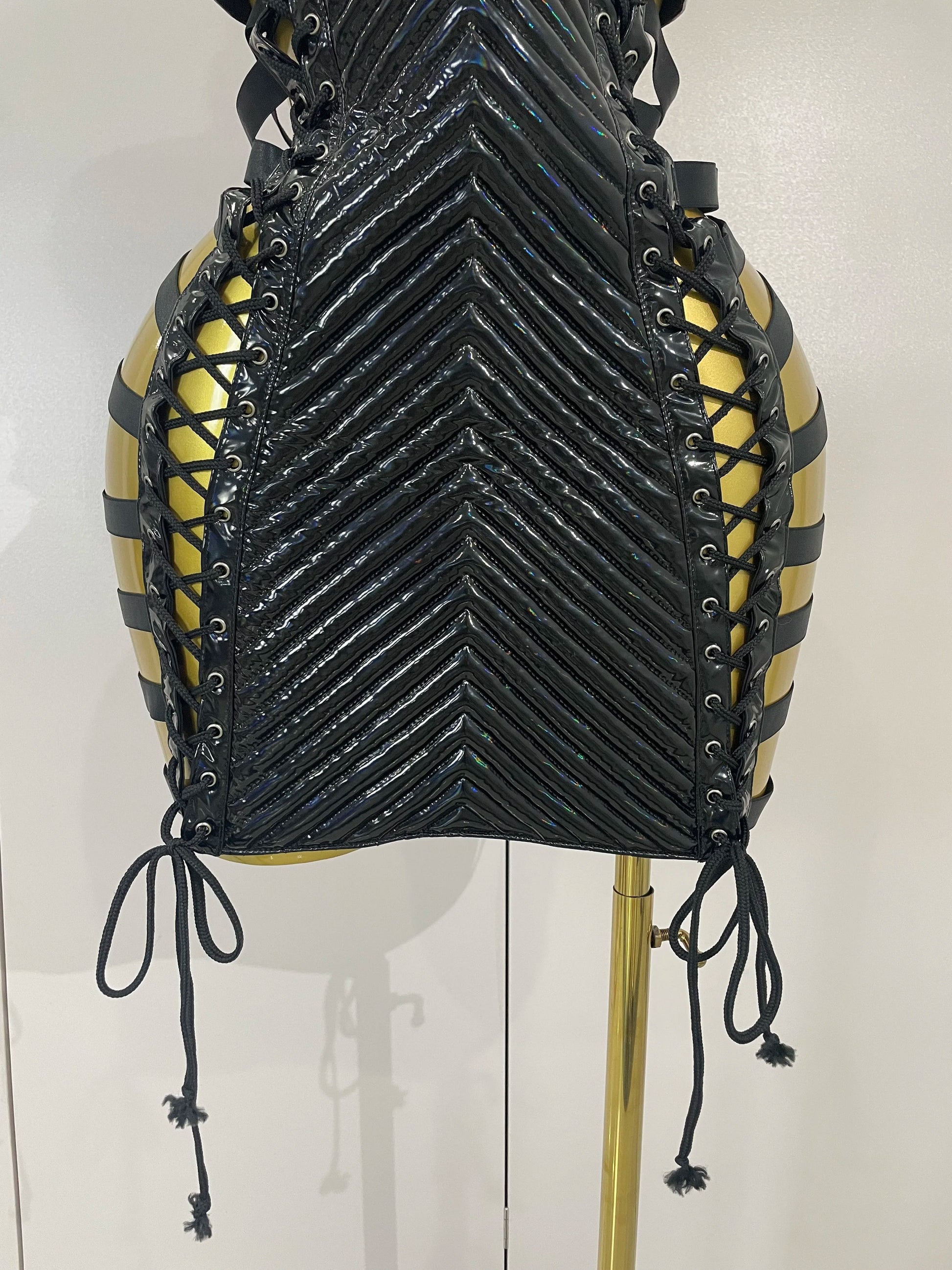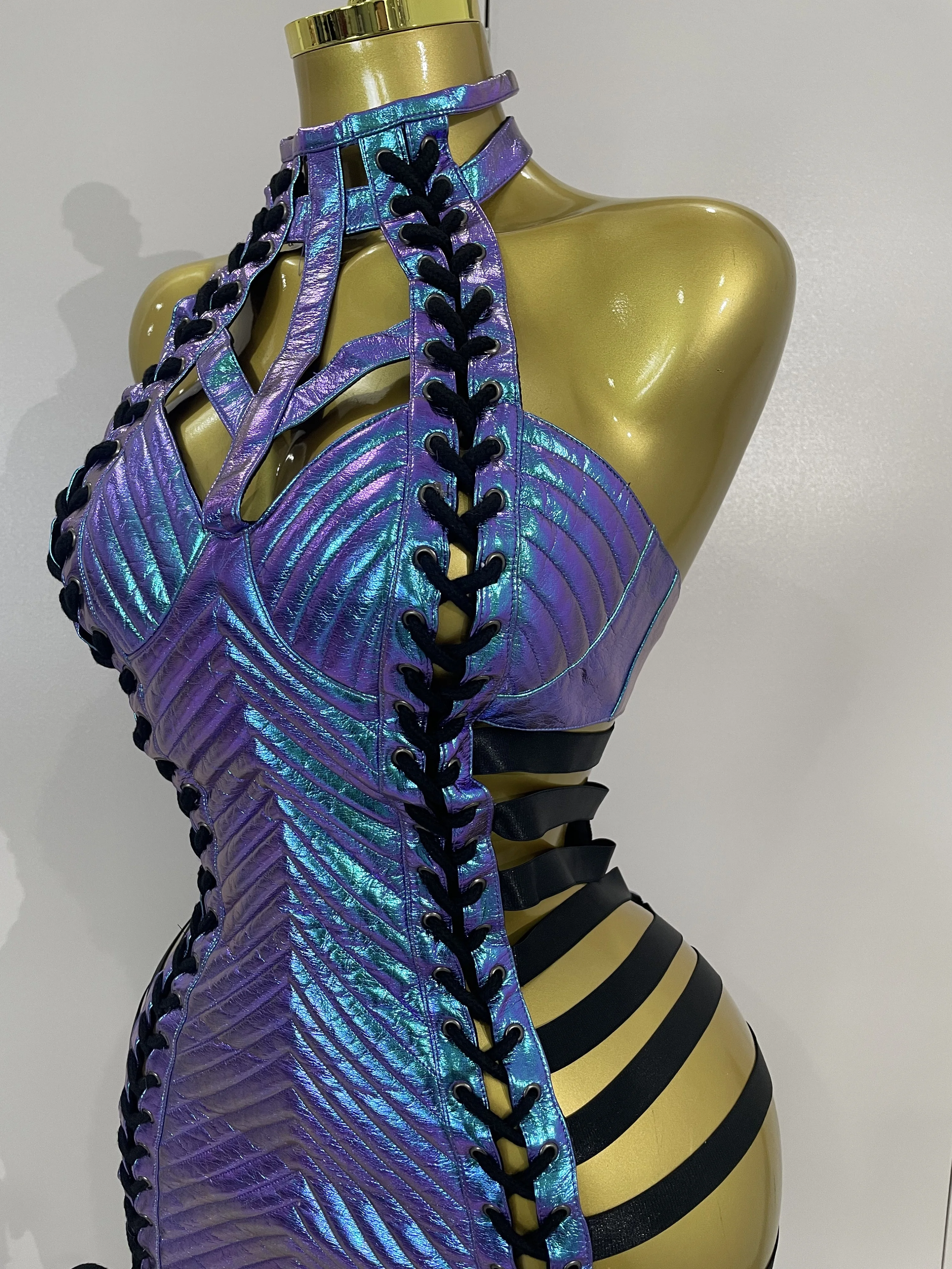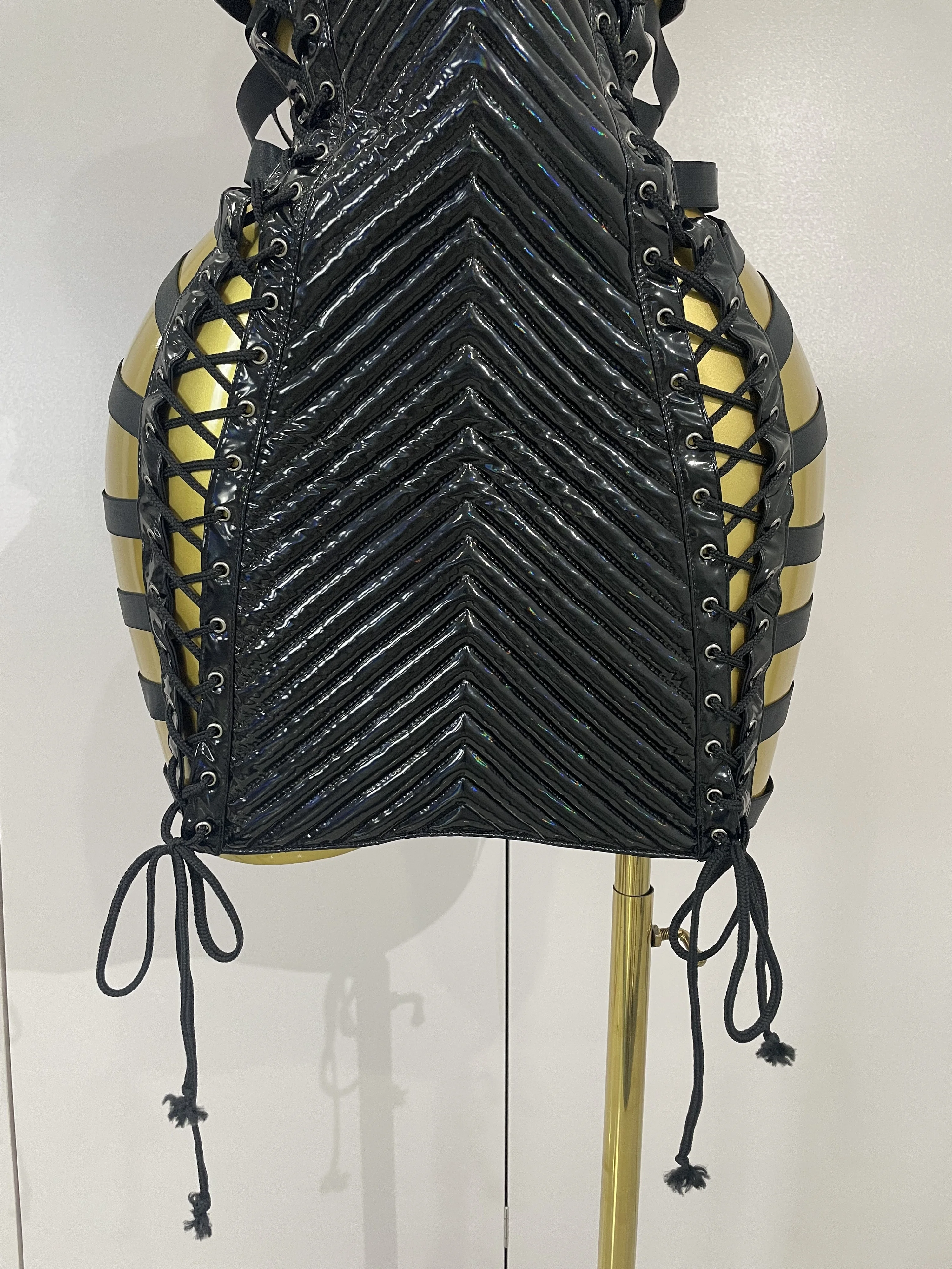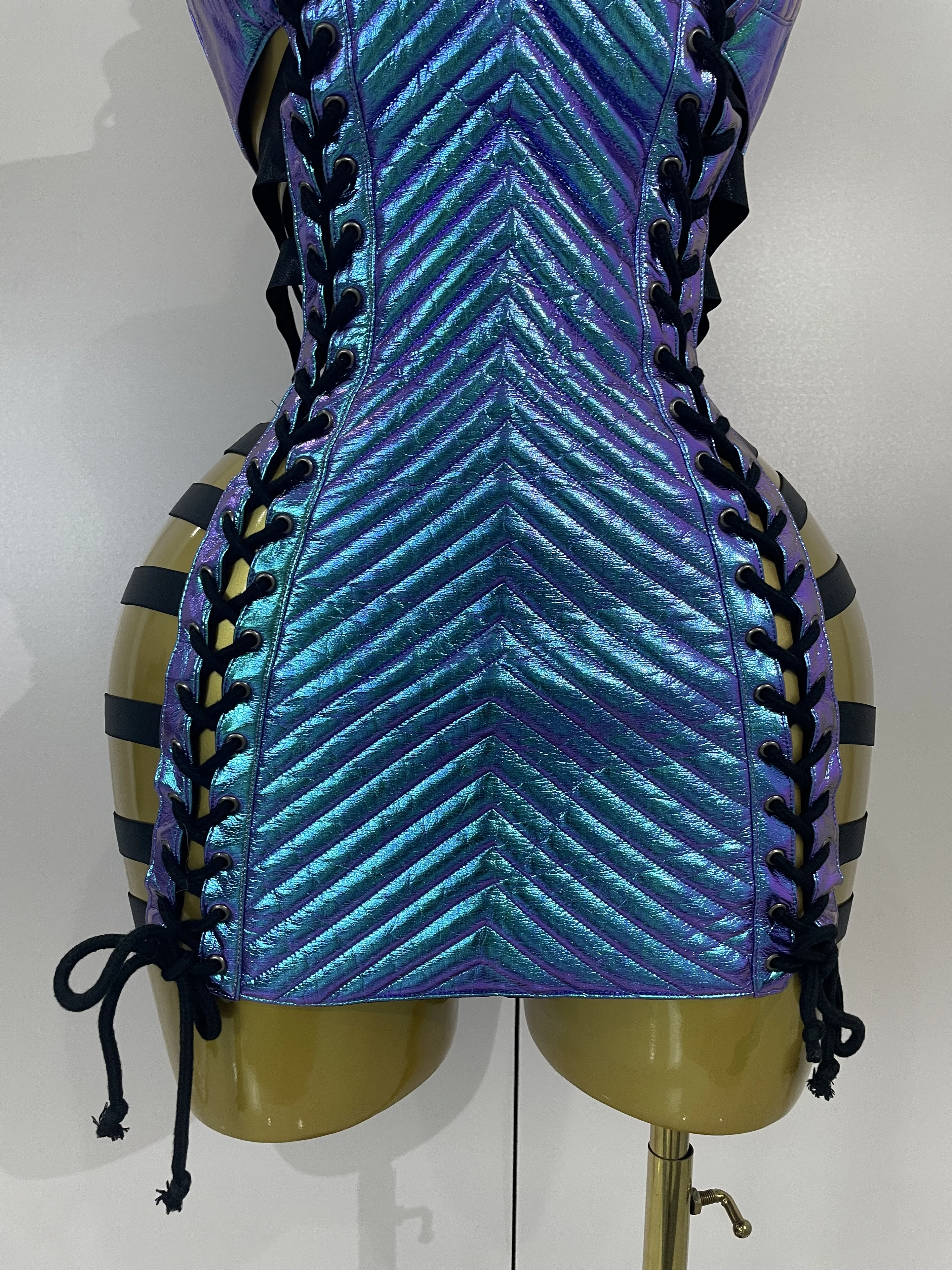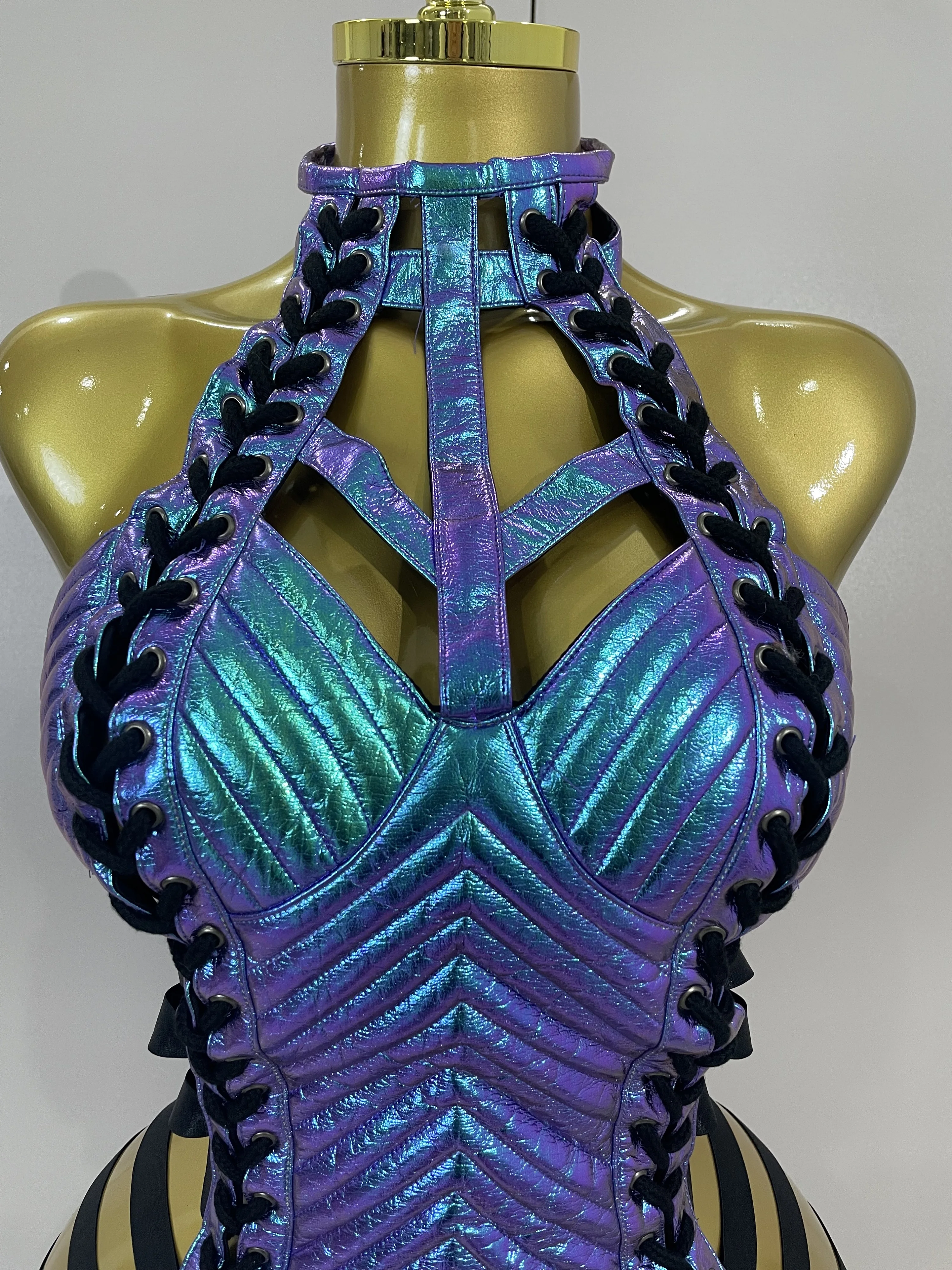 Sexy Black Leather Hollow Out Gothic Bandage Halter Short Dress Women Gogo Dance Singer Nightclub Bar Performance Stage Wear
