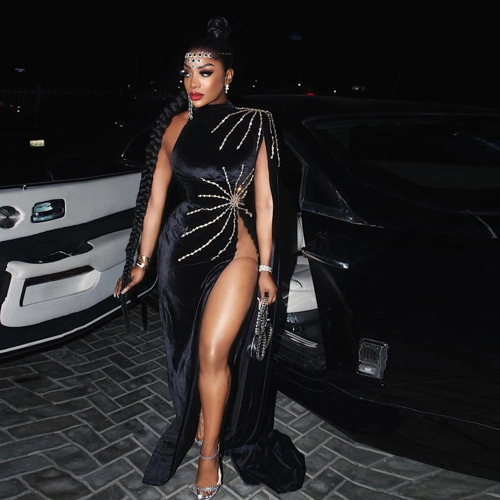Velvet Black Sexy Long Prom Dresses Crystals Sparkly High Split Black Girl Women Elegant Party Evening Gowns Custom Made
