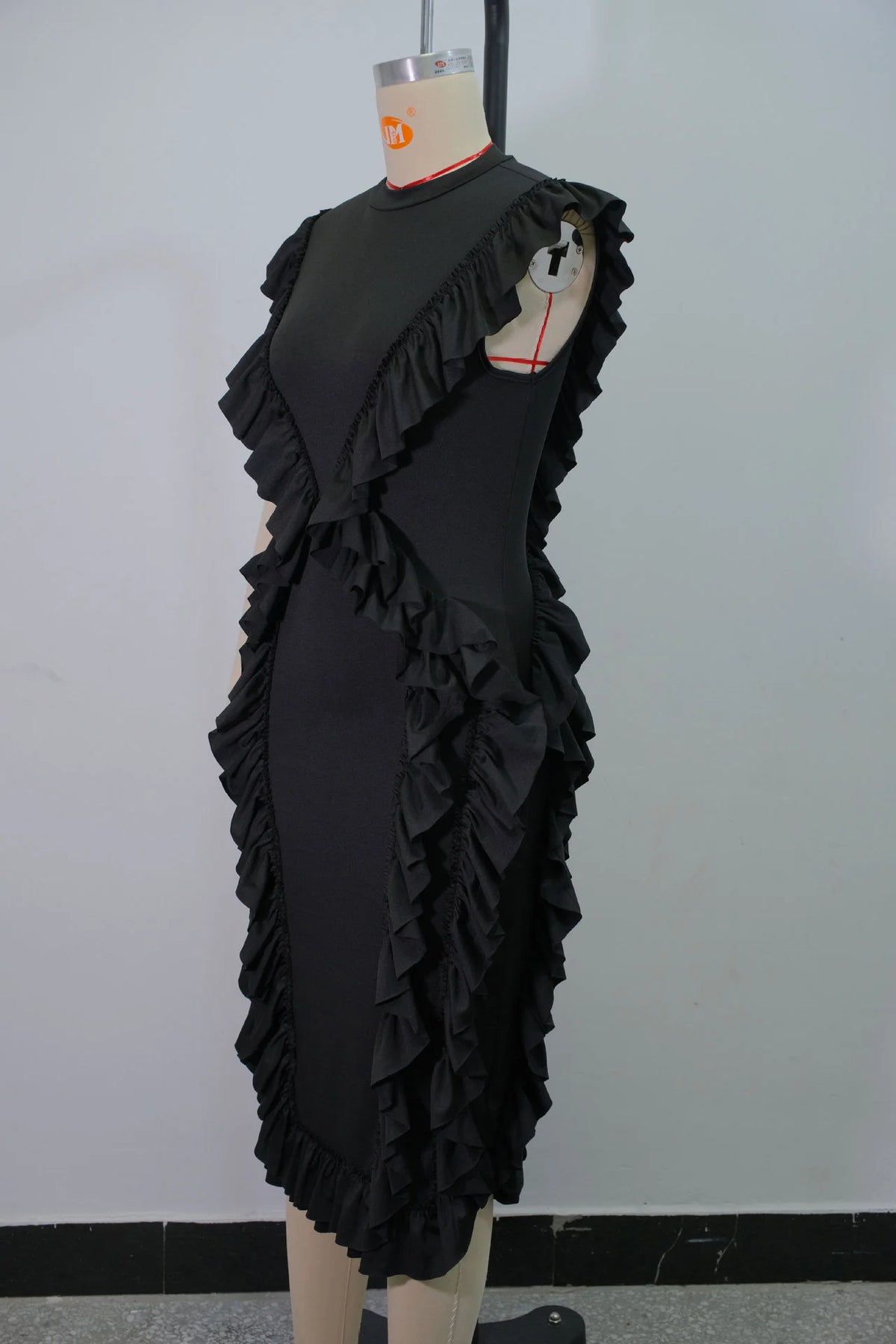 Featuring a round neck, tassel decoration, and ruffle hem, this dress combines elegance with a touch of playfulness.
